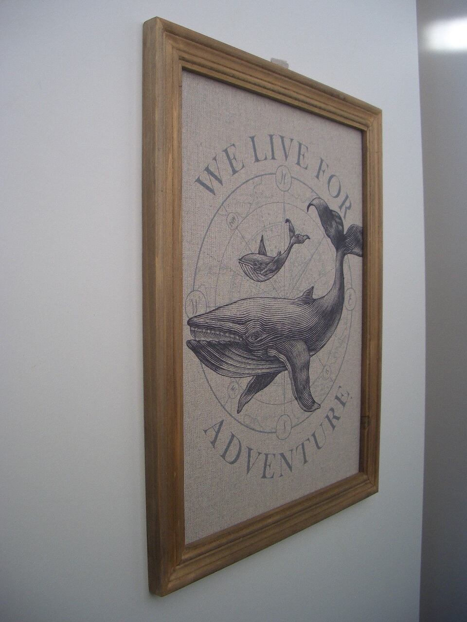 ナチュラルウッドのフレーム、リネンキャンバスに泳ぐクジラがプリントされた、おしゃれなアートフレームです。