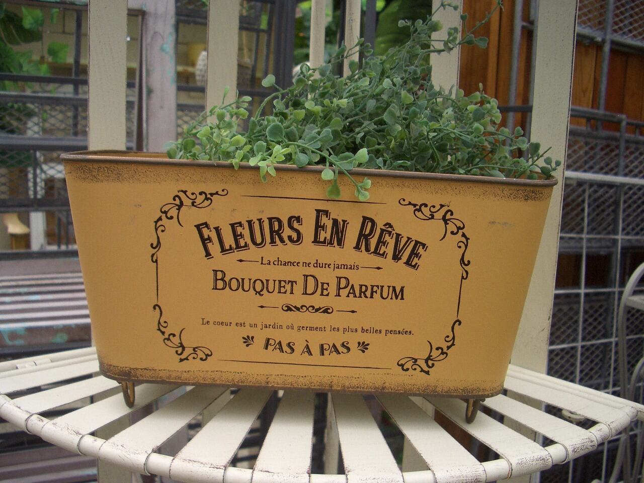 使い込んだアンティーク調の加工がされたブリキプランターです。