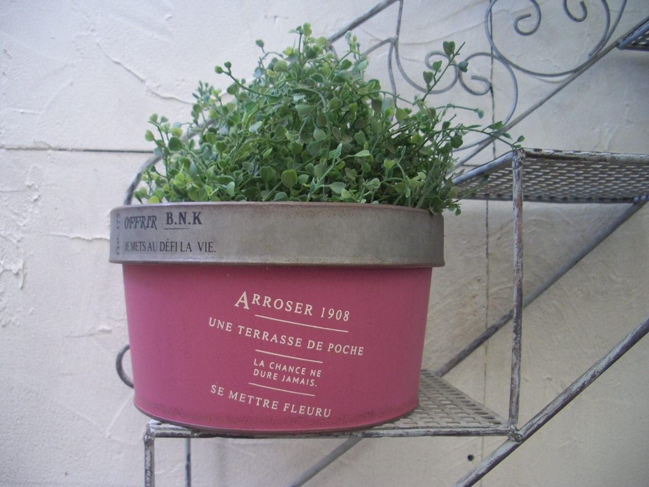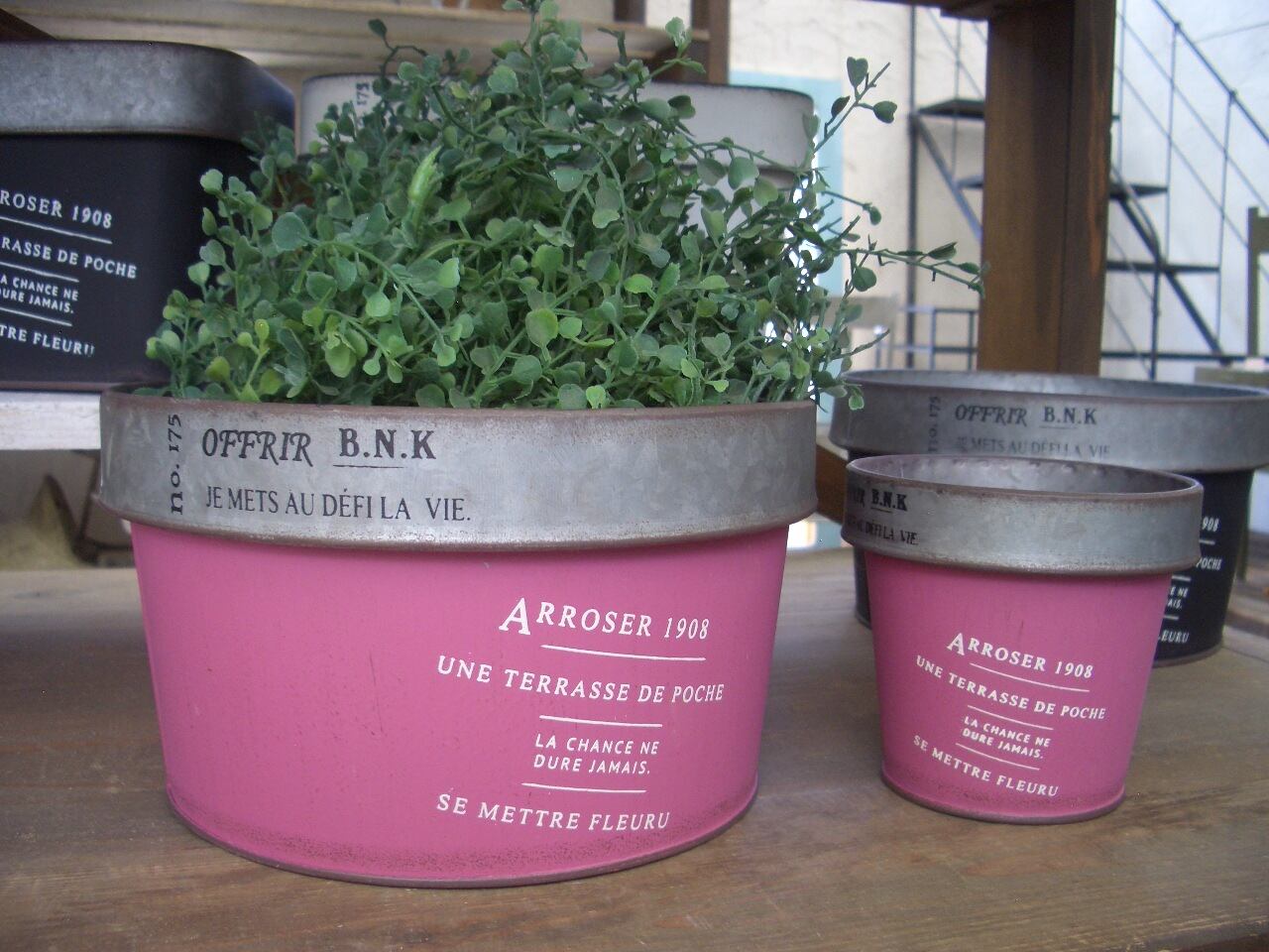 アンティークな風合いでフランス語の文字が素敵なブリキポットです。