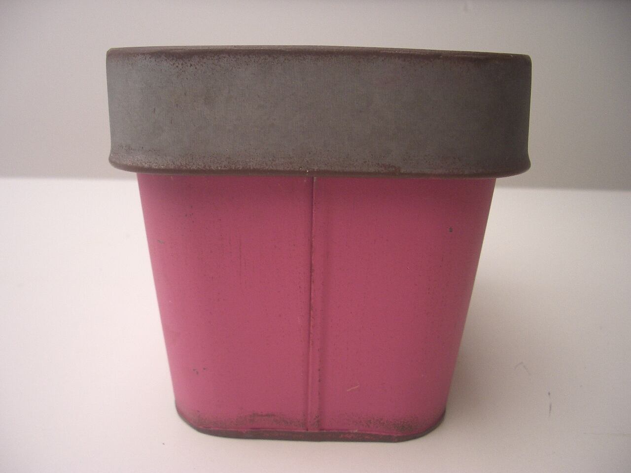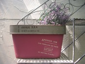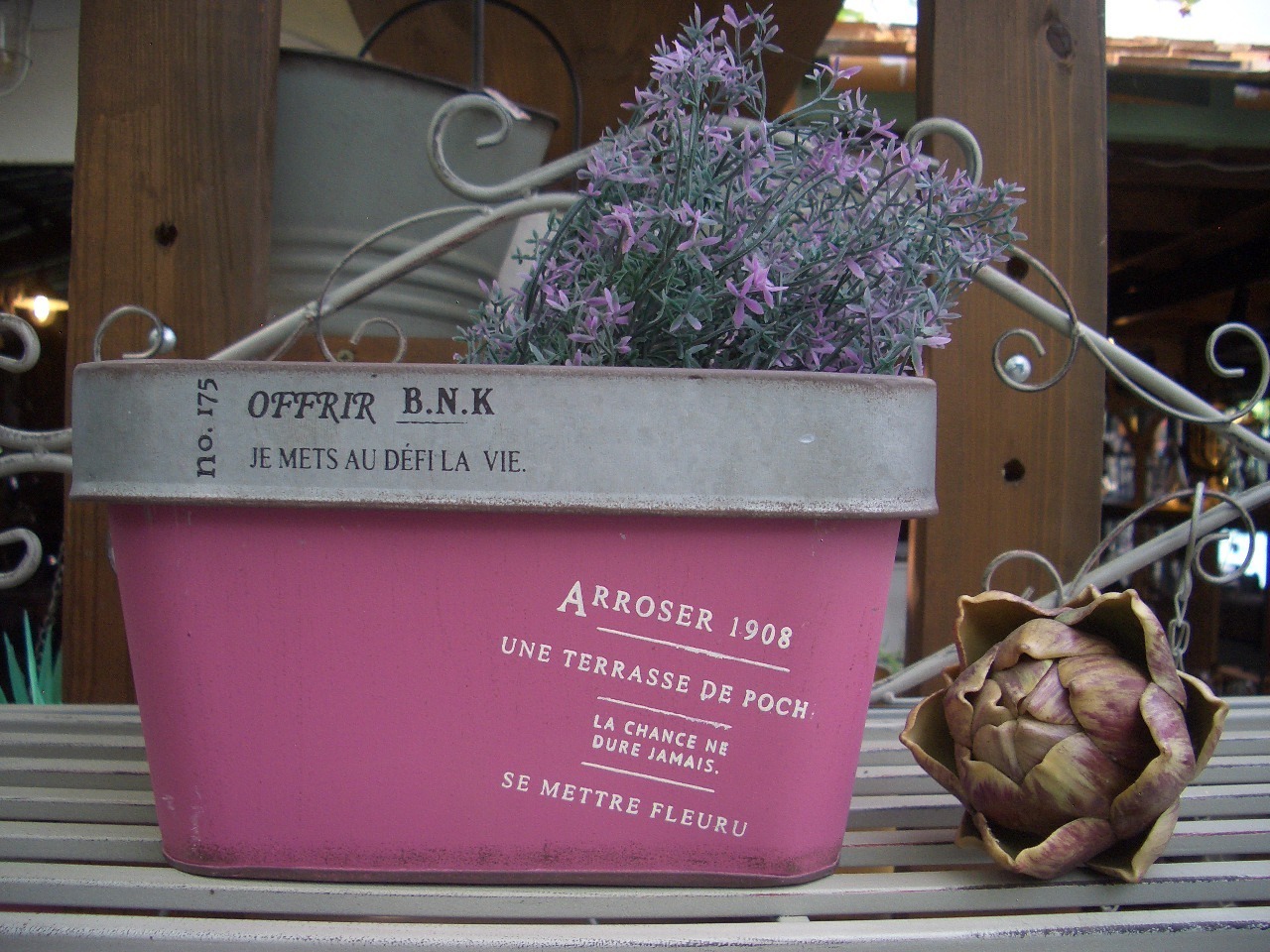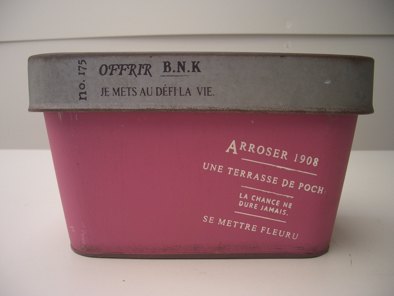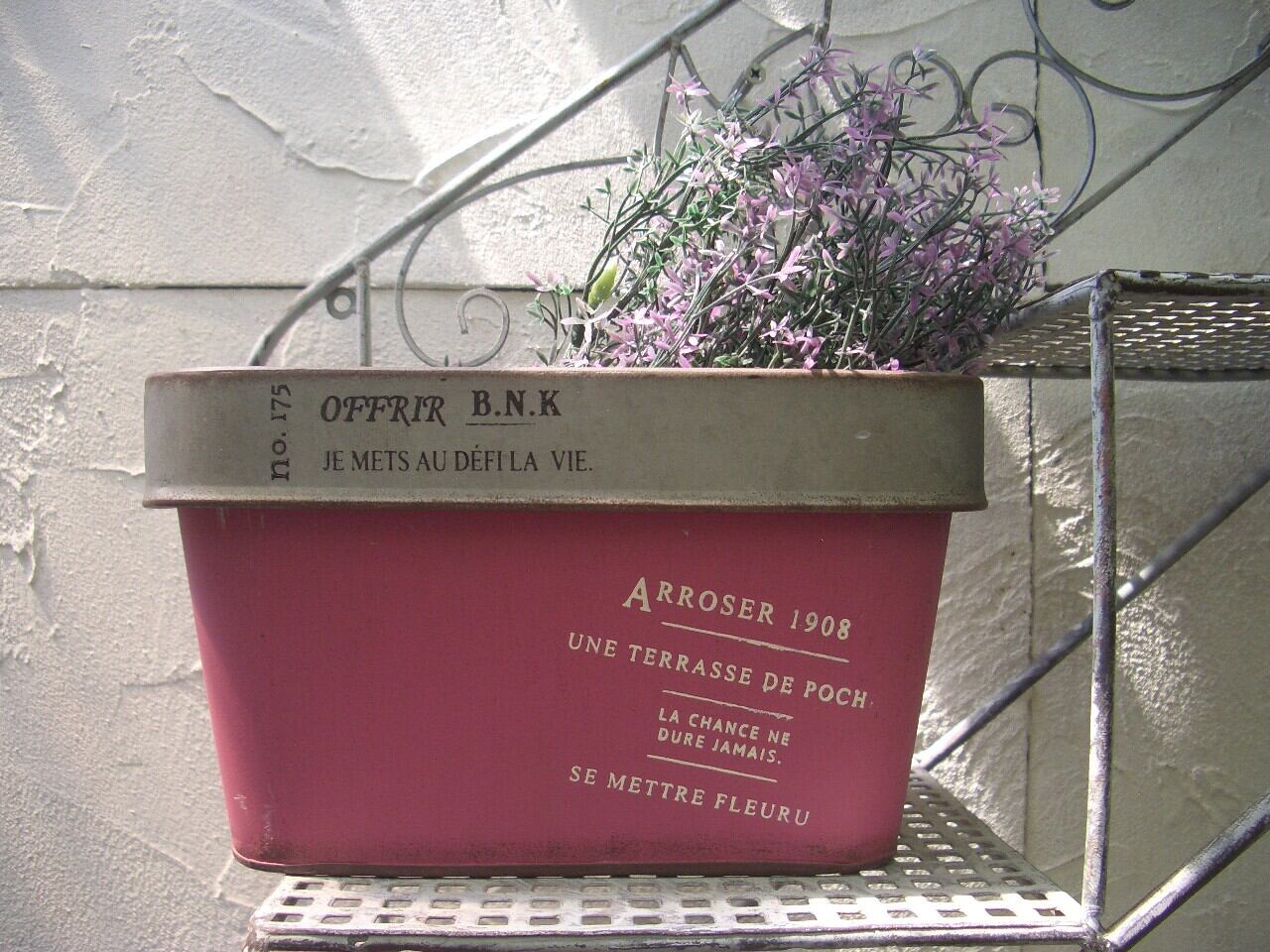 アンティークな風合いでフランス語の文字が素敵なブリキポットです。