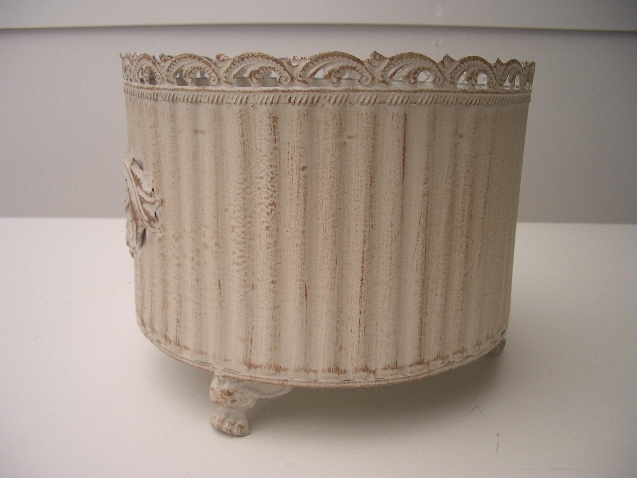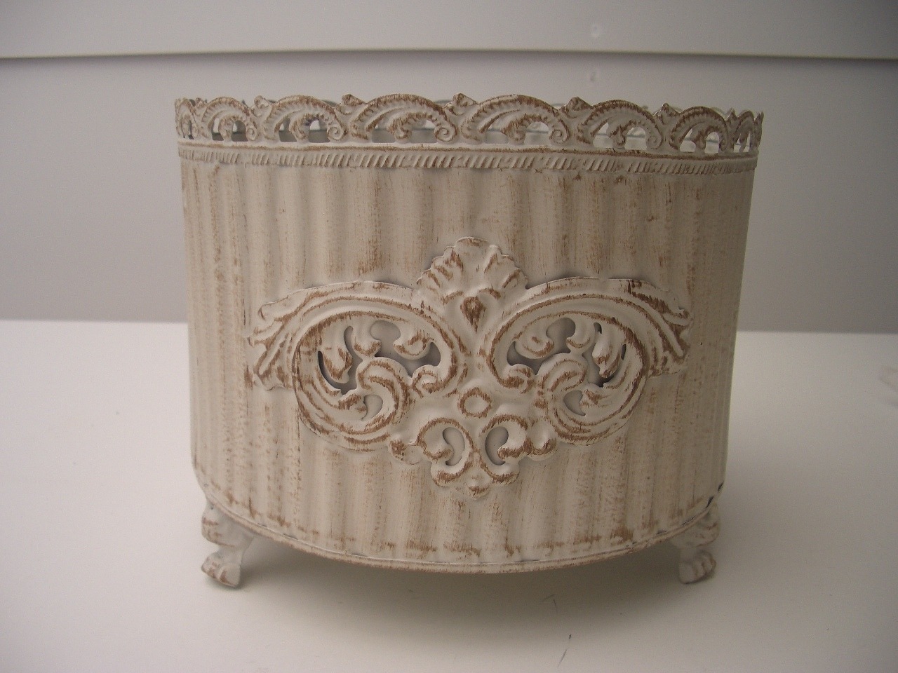 エレガントなデザインのラウンド型のブリキポットです。