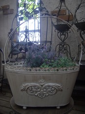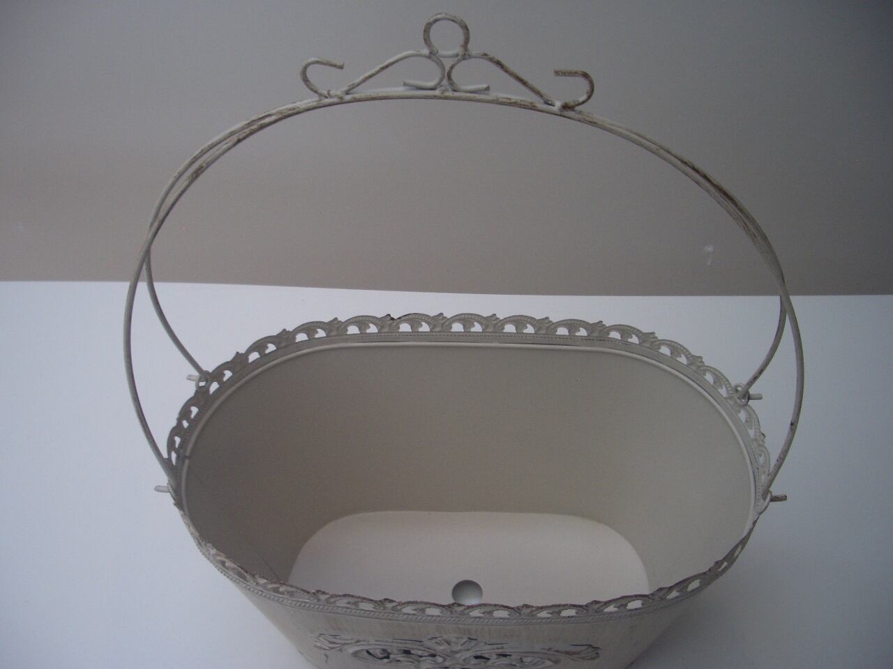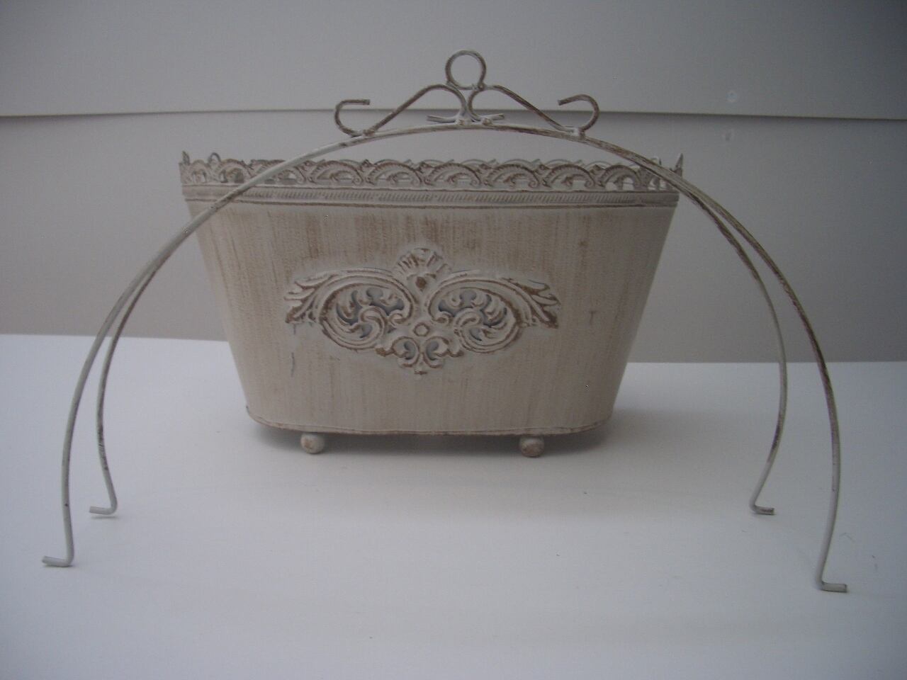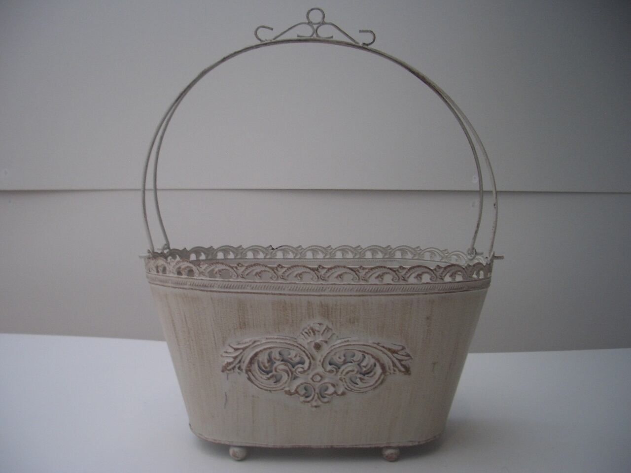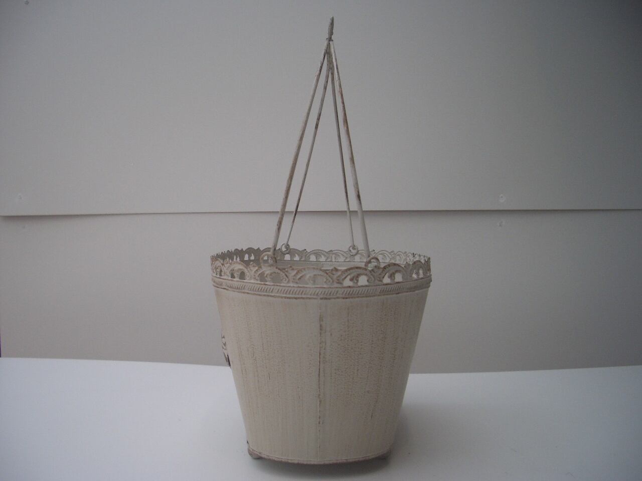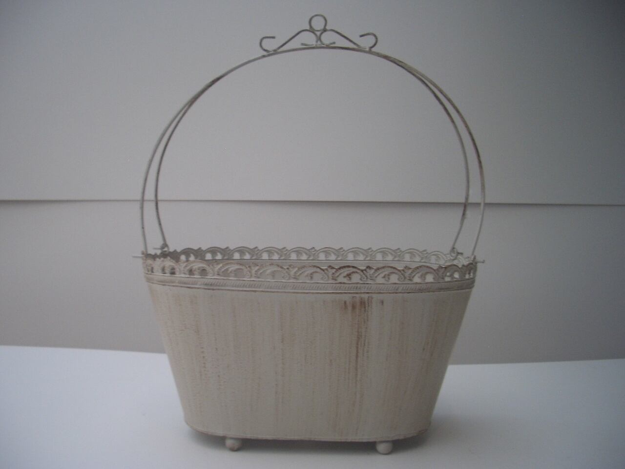 エレガントなデザインのバスケット型ブリキポットです。