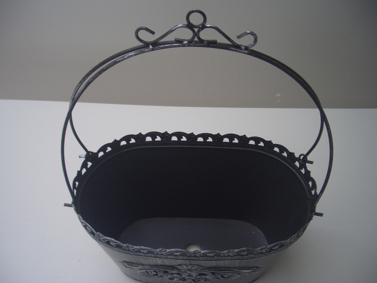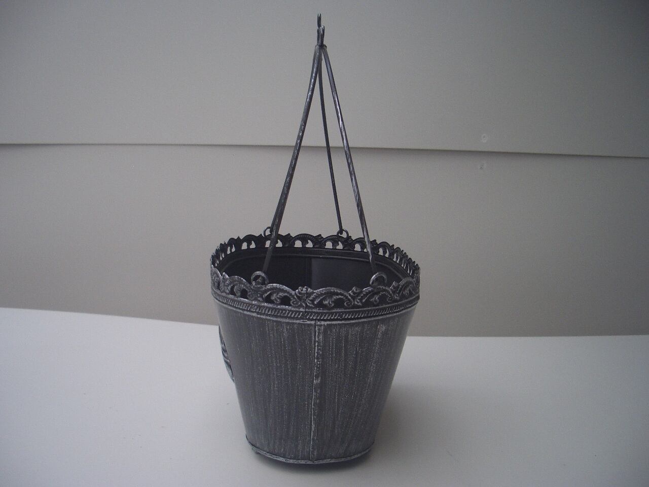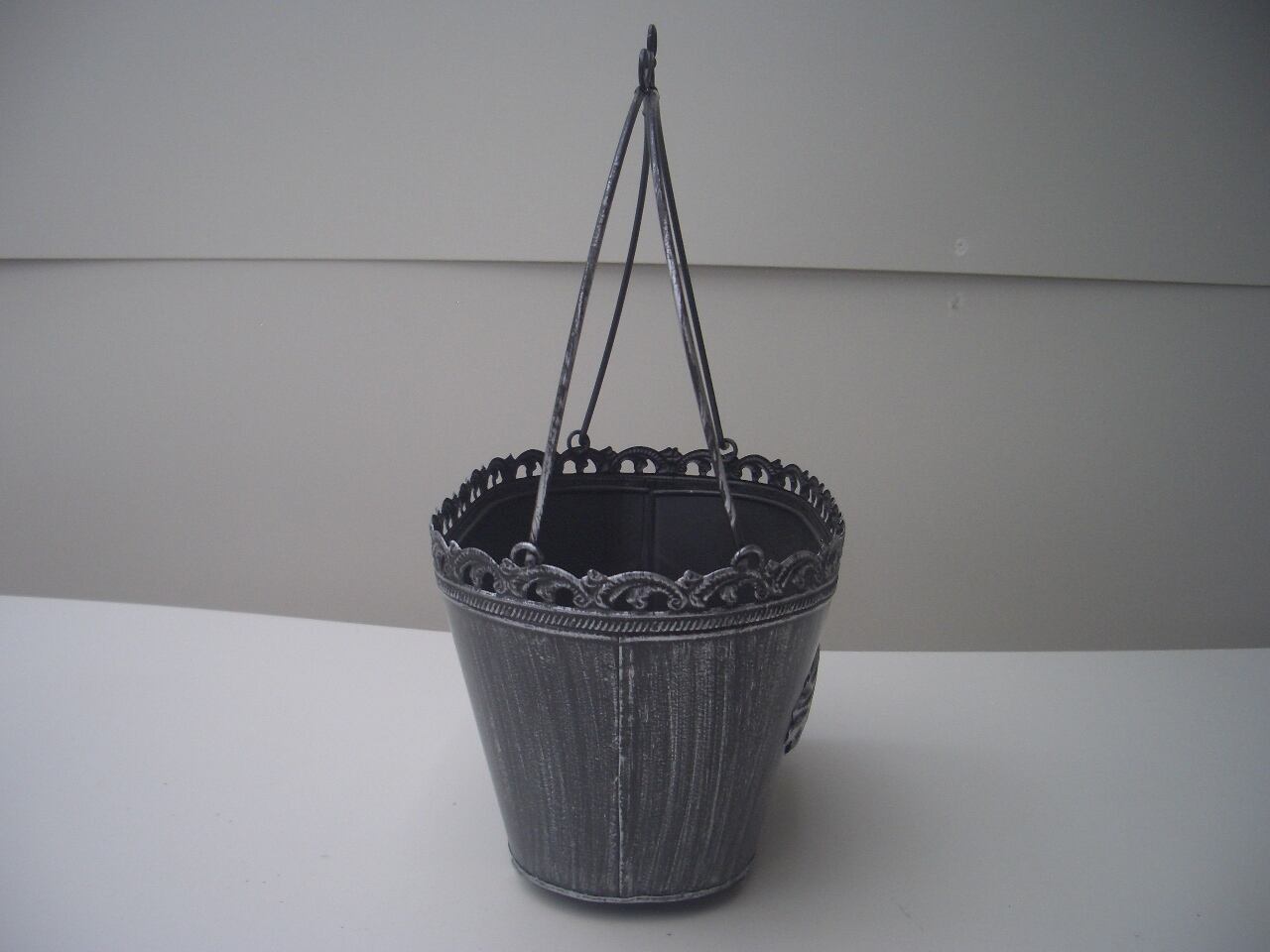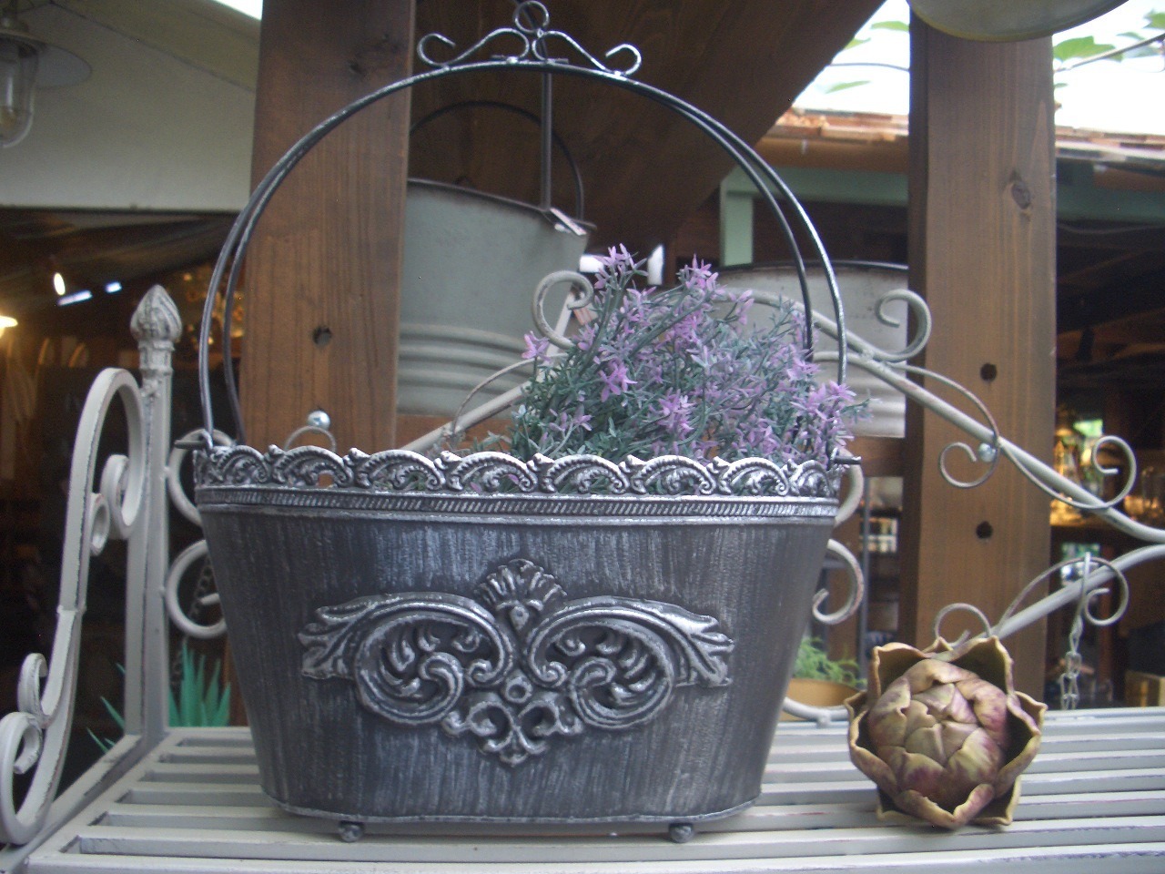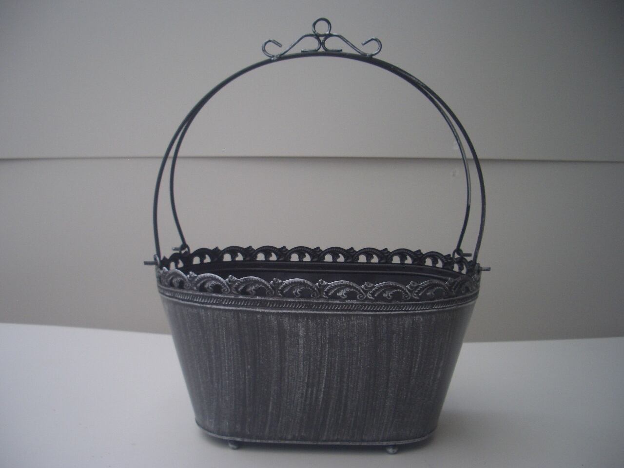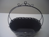 エレガントなデザインのバスケット型ブリキポットです。