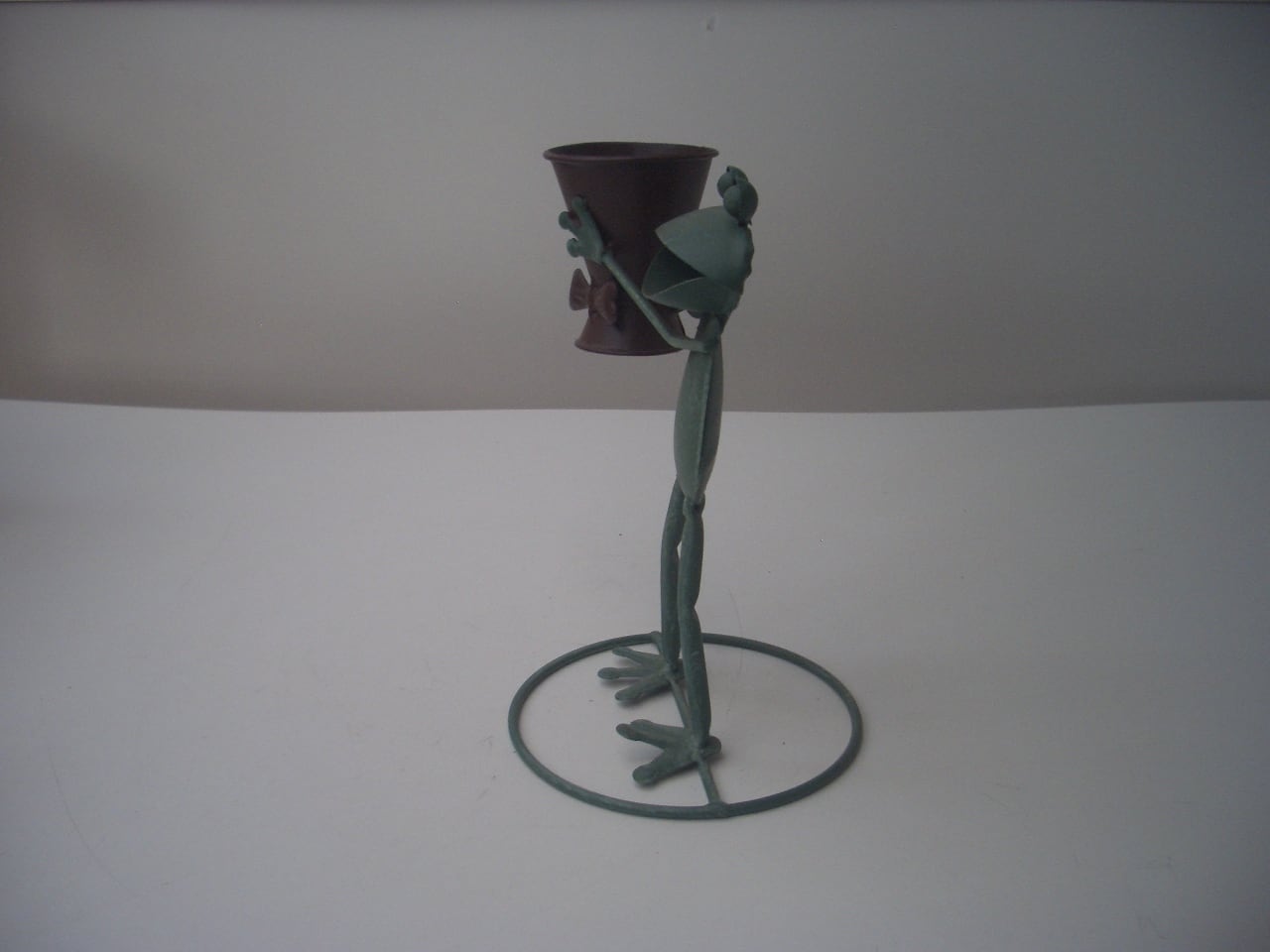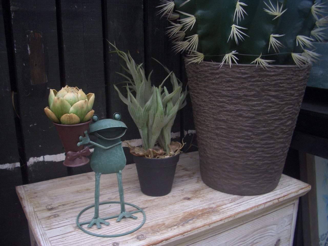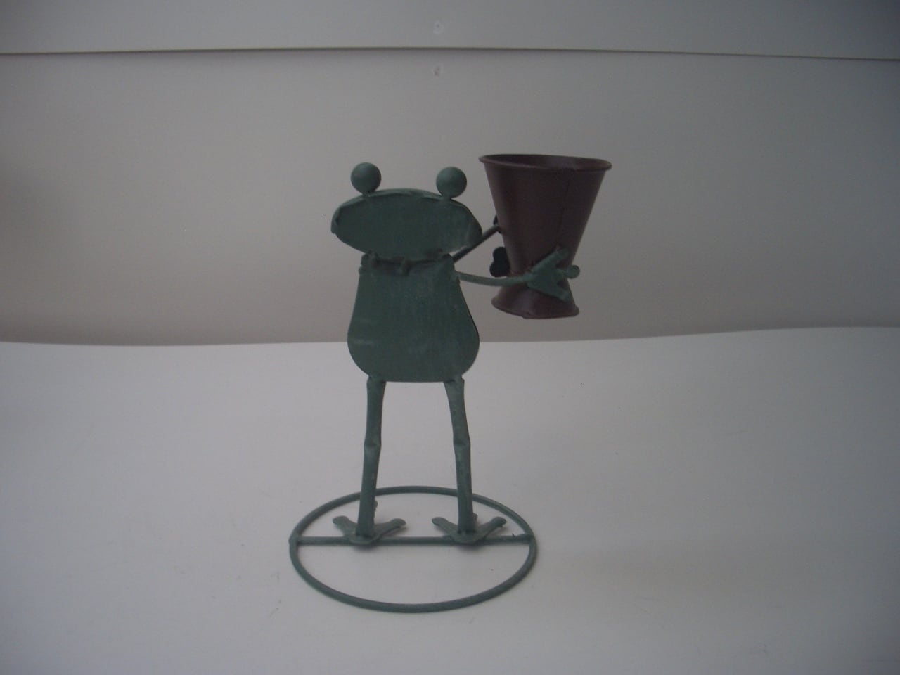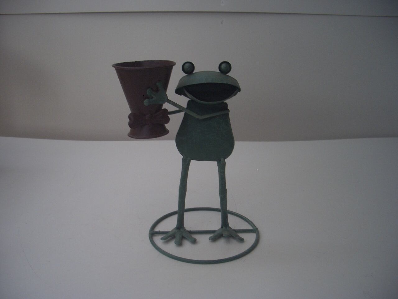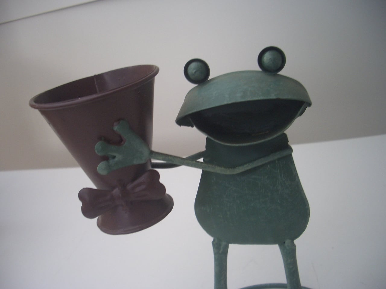 ブーケ風のポットを持ったカエルの置物/ガーデニングオブジェです。