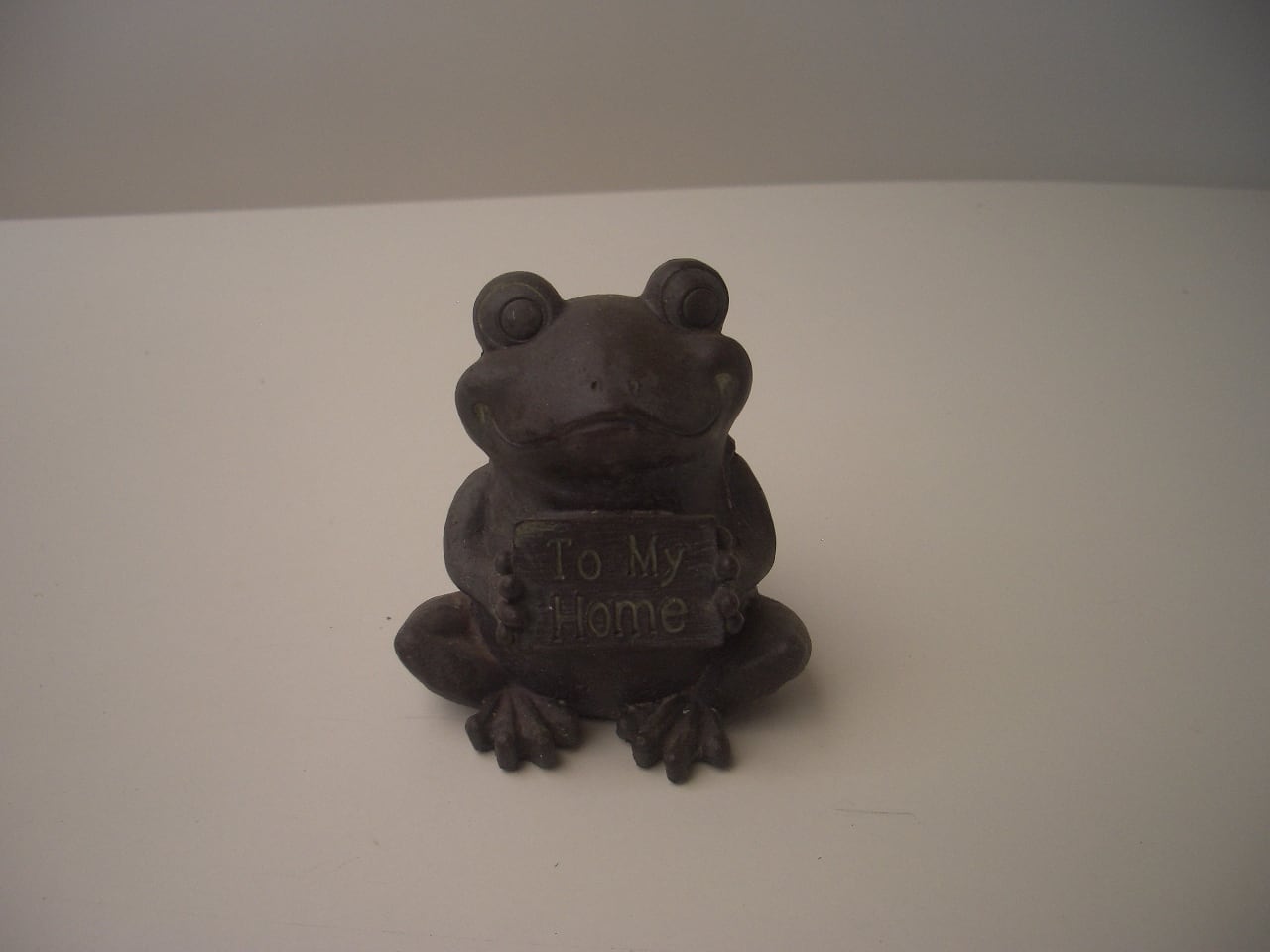 「To My Home」というボードを持ったカエルの置物/ガーデニングオブジェです。