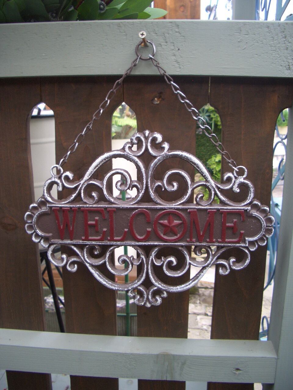 玄関先やガーデンに吊り下げてオブジェとして楽しめるアイアン製のウェルカムプレートです。
